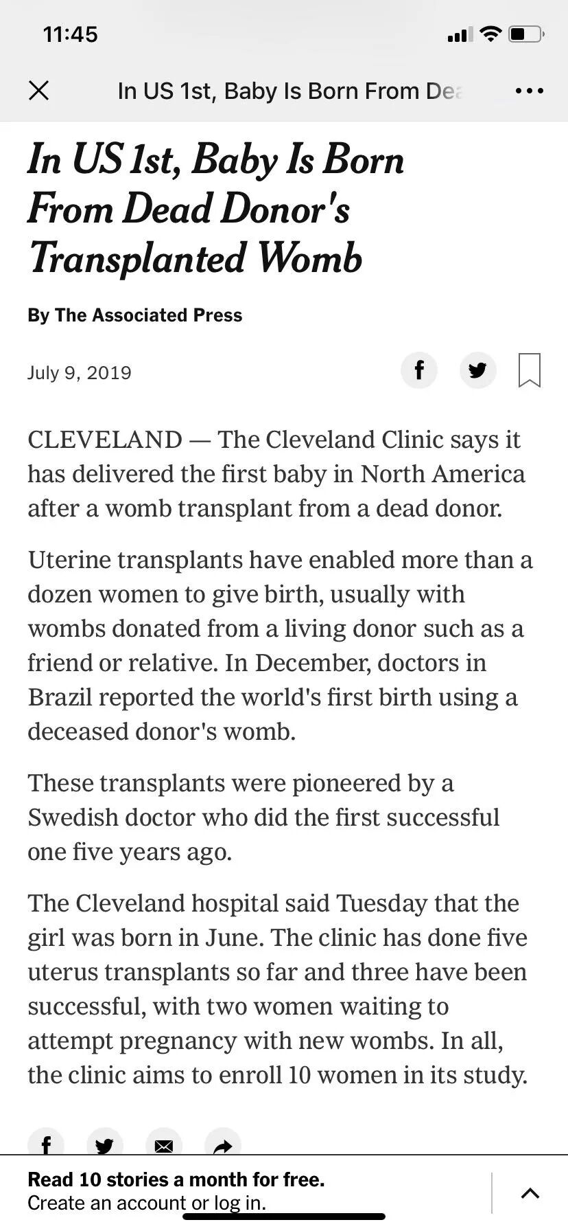 据克利夫兰诊所报道,美国第一位使用已故捐献者子宫的婴儿成功生产。